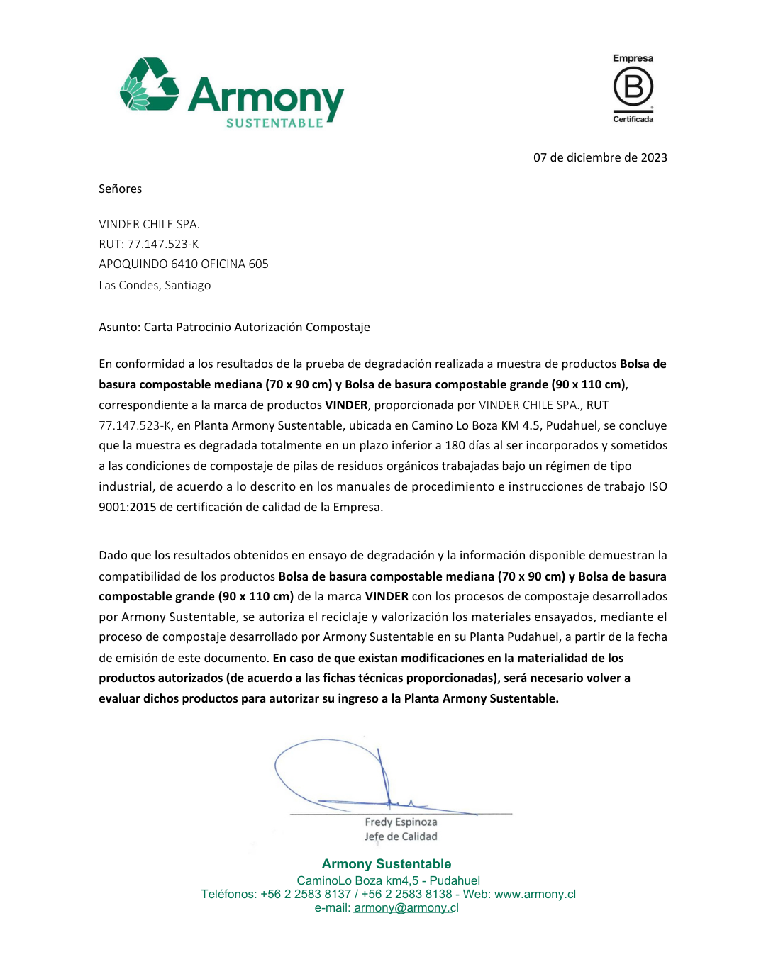 Contamos con el respaldo de Armony Sustentable, una de las mayores plantas de compostaje del país. Esto refleja nuestro compromiso compartido con prácticas ambientalmente responsables y sostenibles.