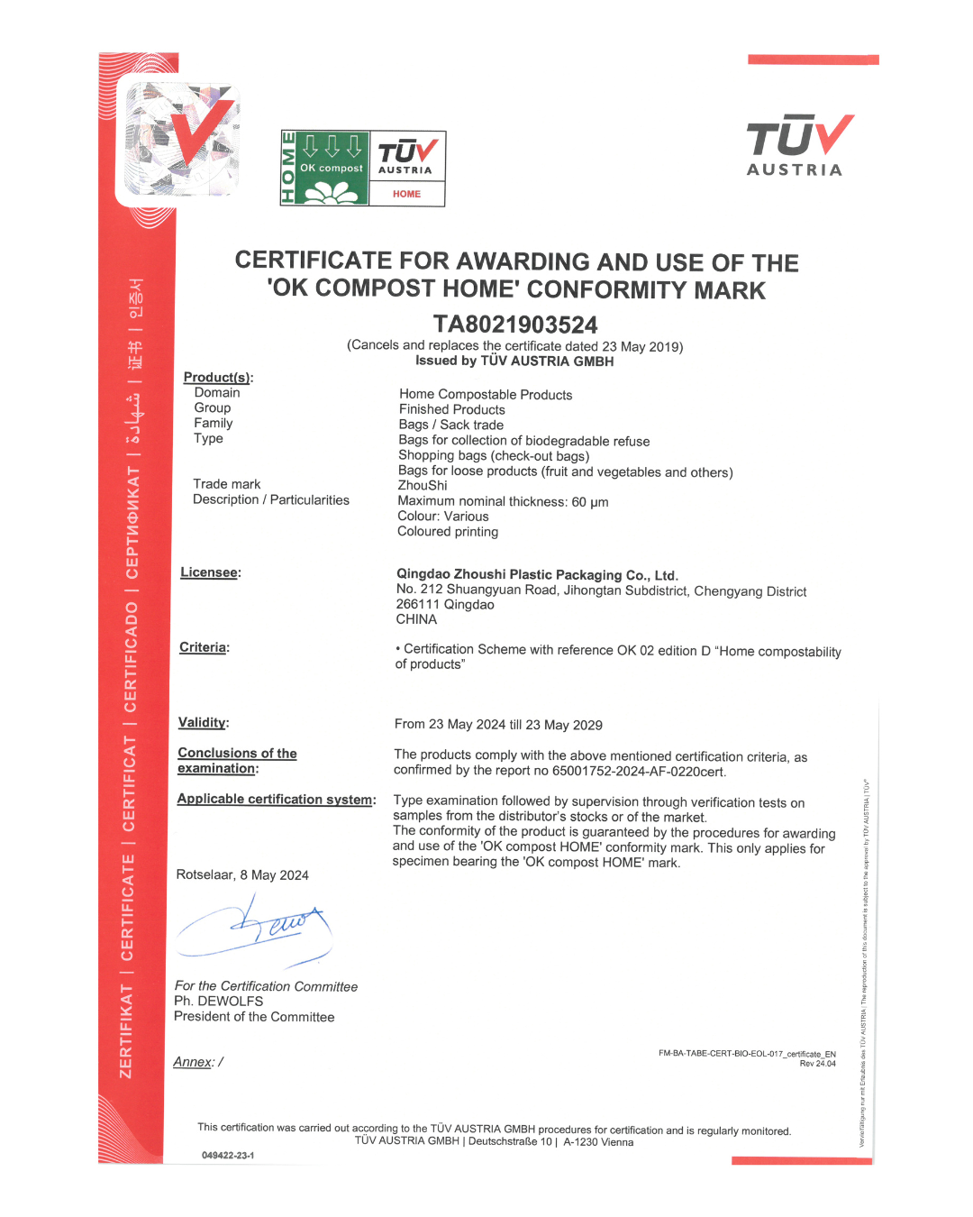 Certificación de TÜV AUSTRIA que garantiza biodegradabilidad completa en compostaje doméstico.