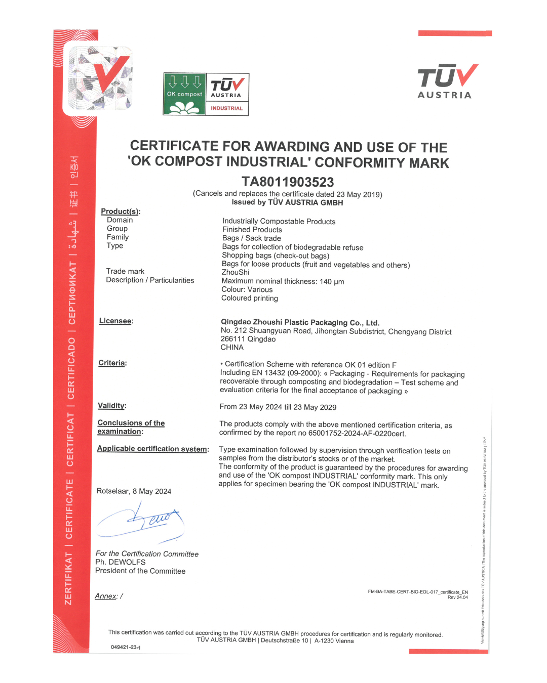 Certificación de TÜV AUSTRIA que garantiza que el producto es 100% biodegradable en plantas de compostaje industrial, incluyendo todos sus componentes, tintas y aditivos.